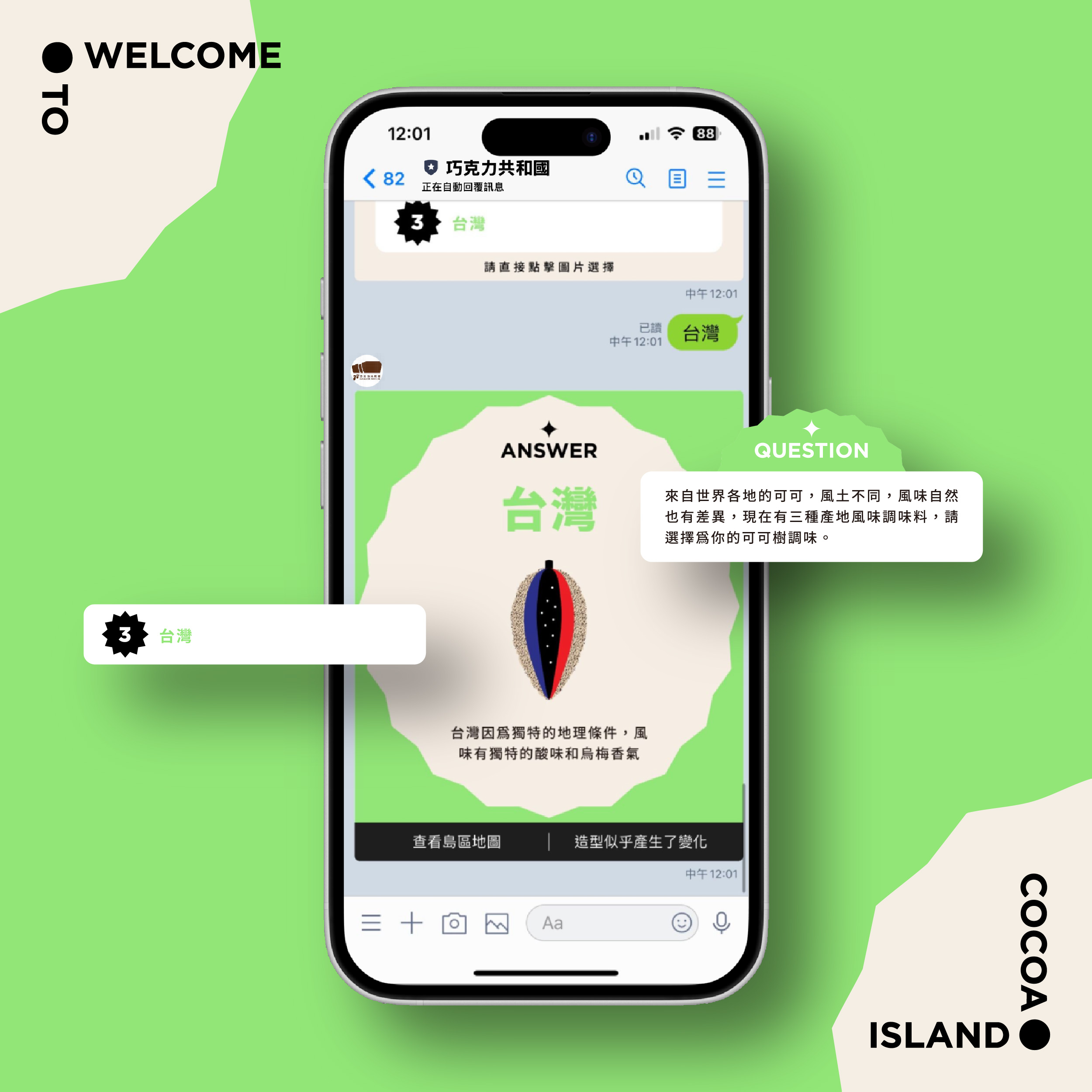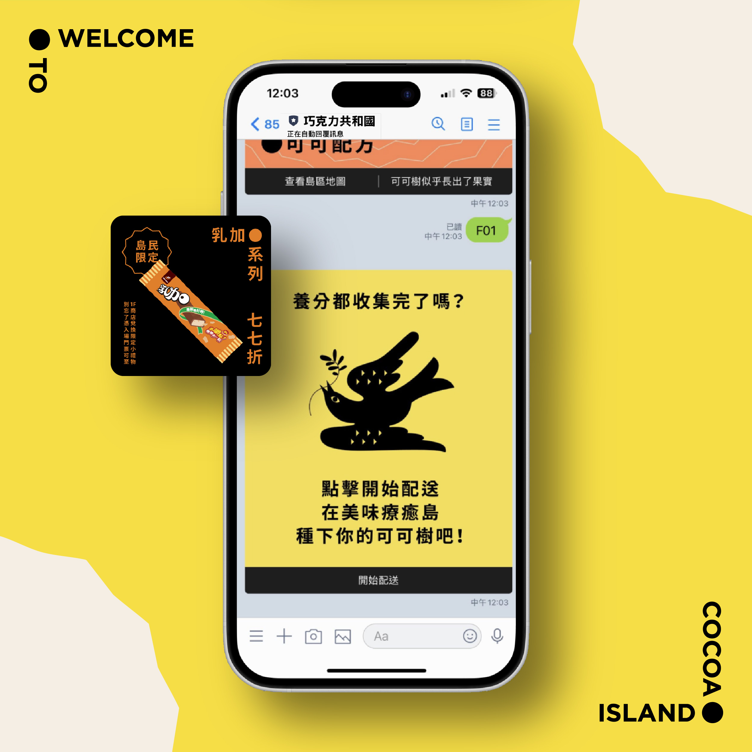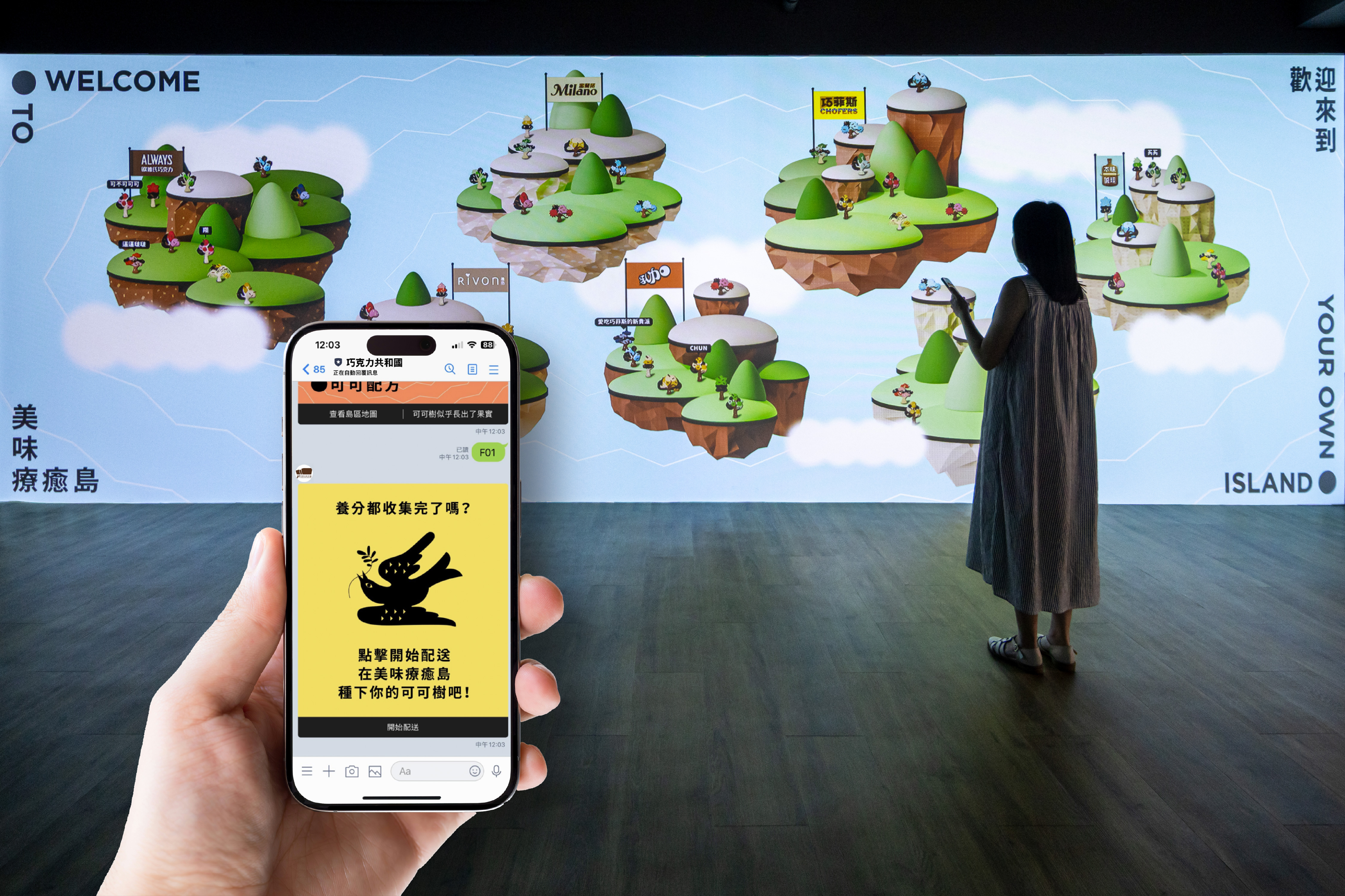 旅程的最終章來到展區核心,完成最後任務——種下專屬的數位可可樹。這棵樹將依據參與過程與互動紀錄,對應至不同的品牌島嶼,並獲得專屬優惠券,即時分享到現場的大型螢幕上,正式成為「美味療癒島」的居民,收藏這段屬的甜蜜記憶。