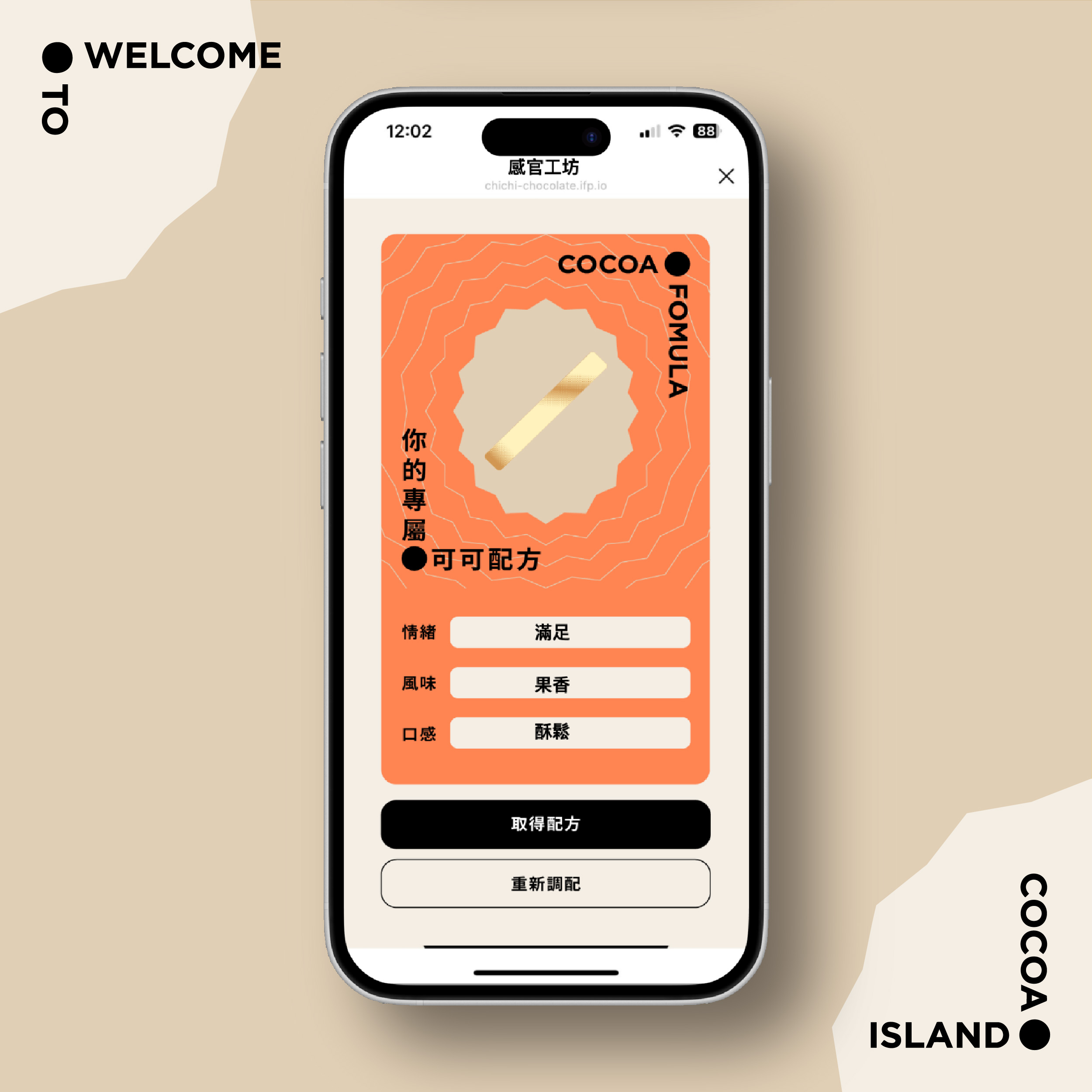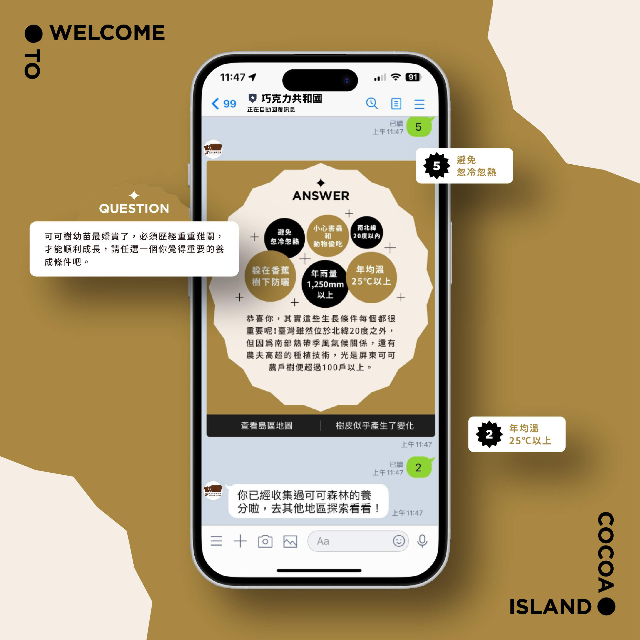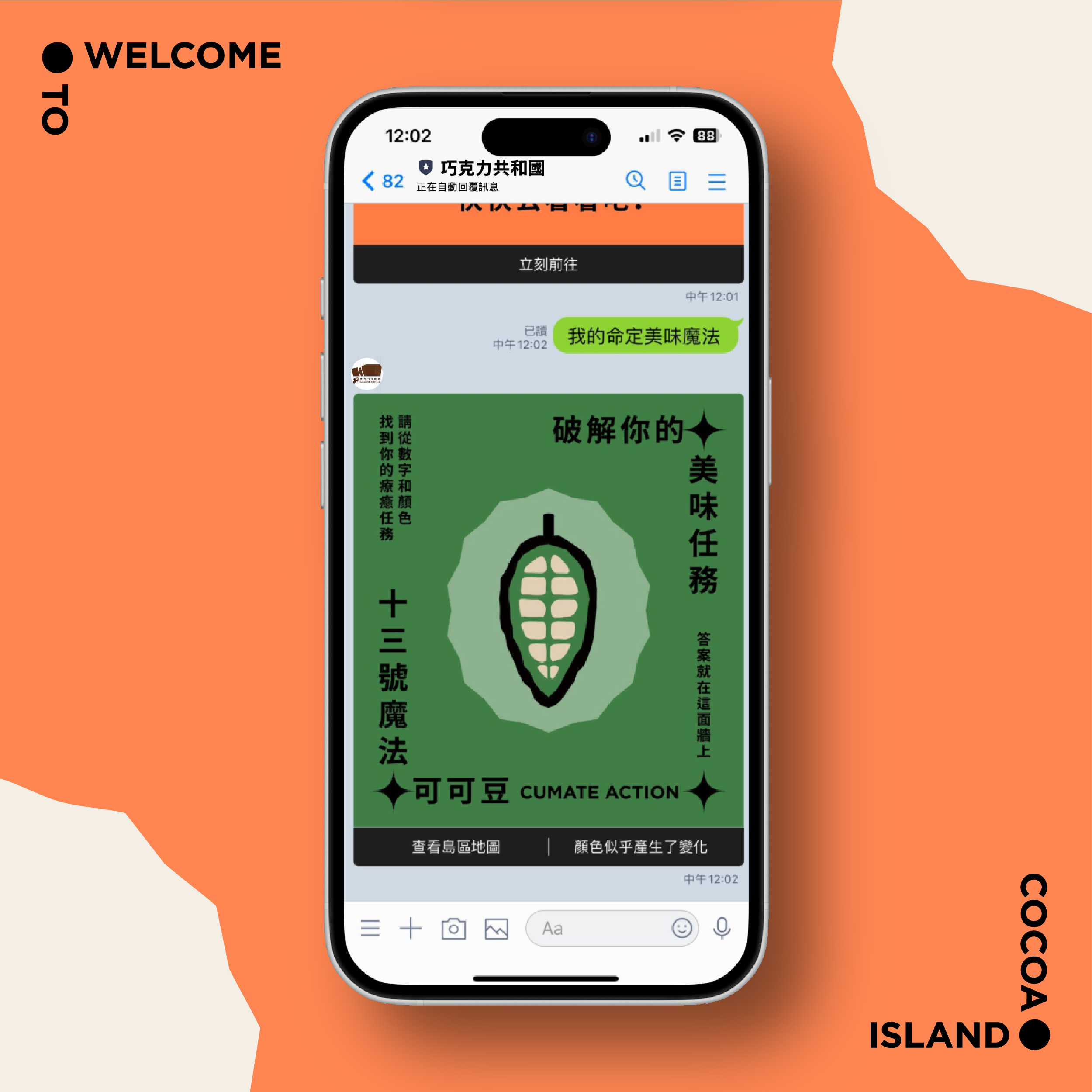養分取得方式除了回答與可可相關的知識問答,還能透過敲擊可可豆,領取 11 種「美味魔法」影響可可樹的色系。在「感官工坊」中,體驗者可開啟相機搭配LINE OA互動,拼湊出屬於自己可可樹的關鍵配方——包括情緒、風味與口感——創造出獨一無二的療癒配方。