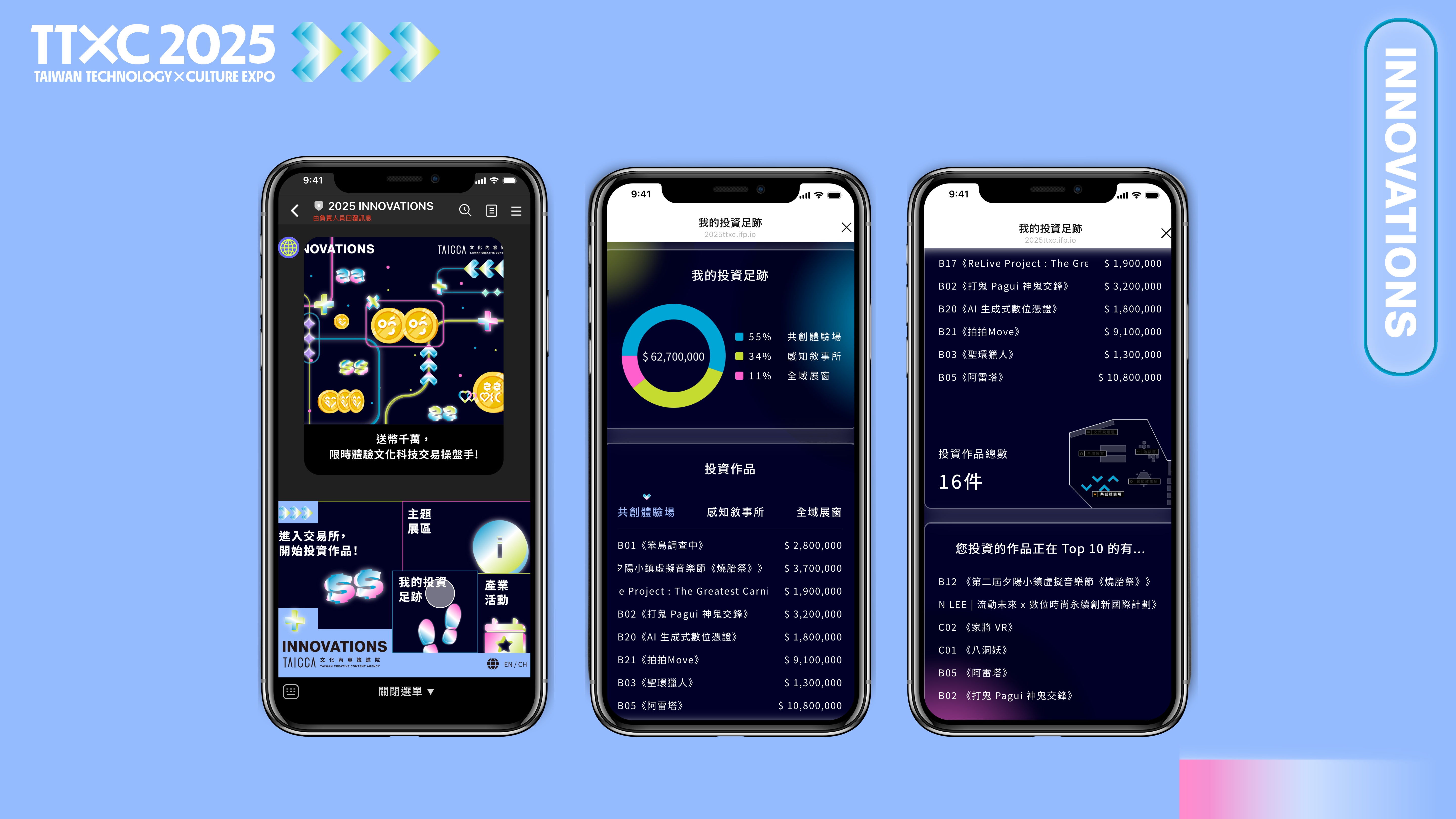 我們將投資流程簡化到極致:輸入作品編號、確認金額、完成投資。互動不只停留在手機裡,每筆交易都會即時反映在現場大螢幕上——「即時投資資訊海」顯示當下投資作品與金額;「TOP 10 ranking board」每三分鐘更新全場排名,讓現場氛圍持續保持交易熱度。
