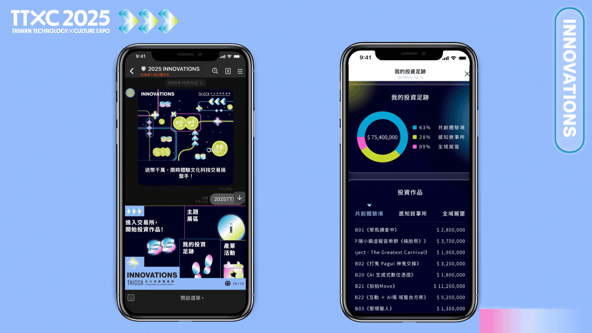 繼 2024 TTXC INNOVATIONS 探討 AI 生成潛力,讓人工智慧成為具備獨立思考的意識分身。2025 我們以文策院「跨域動能:打造文化科技新生態」為題,打造全新 LINE OA 數位體驗《文化科技交易所》,讓觀眾不只看展,而是真正踏入市場。